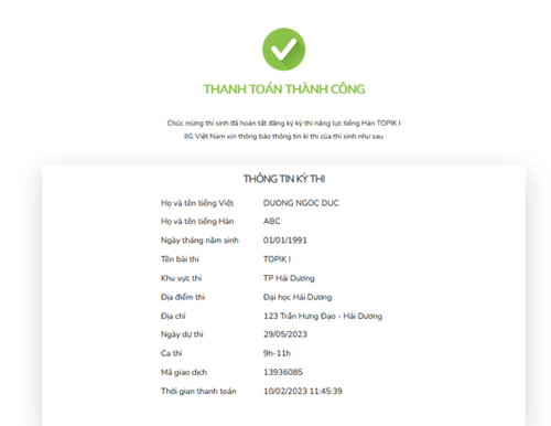Hệ thống sẽ tự động thông báo kết quả đăng ký và thanh toán thành công trên website và email mà thí sinh đã đăng ký. Vì vậy, thí sinh cần kiểm tra email (bao gồm cả hòm thư spam) để chắc chắn rằng mình được nhận thông báo kết quả đăng ký và thanh toán thành công.