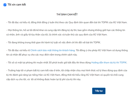 - Các thông tin cần cung cấp: Họ và tên (tiếng Việt), Họ và tên (tiếng Hàn), Ngày tháng năm sinh, số giấy tờ tùy thân (CCCD/ CMND/ HC), Địa chỉ liên hệ, Số điện thoại liên hệ, Email nhận thông tin, Thông tin dự thi (lựa chọn theo lịch thi được cung cấp trên hệ thống)