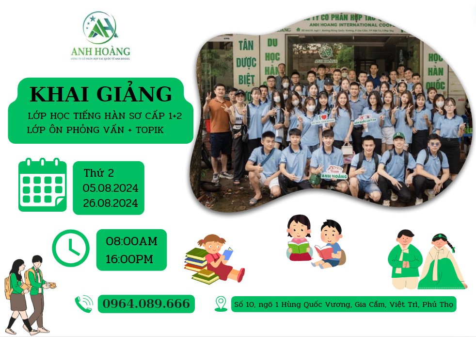 Chào mừng các bạn đến với lịch khai giảng Tiếng Hàn tại Du Học Anh Hoàng. Với đội ngũ giáo viên đầy kinh nghiệm và chương trình học được xây dựng chu đáo, kĩ lưỡng, linh hoạt và chất lượng, chúng tôi cam kết sẽ mang đến cho bạn hành trang kiến thức đầy đủ nhất giúp các bạn có những bước đi vững trãi, chắc chắn trên con đường học tập ngôn ngữ này. Các bạn muốn học tập thêm ngôn ngữ Hàn để làm việc, các bạn muốn học tập tiếng Hàn để đi du học. HÃY ĐẾN VỚI CHÚNG TÔI! Đăng ký ngay để trở thành một phần của cộng đồng học viên tiếng Hàn tại Du Học Anh Hoàng. Học viên có thể liên hệ trực tiếp với Mr.Hoàng Anh qua số 0964.089.666 để được trợ giúp.